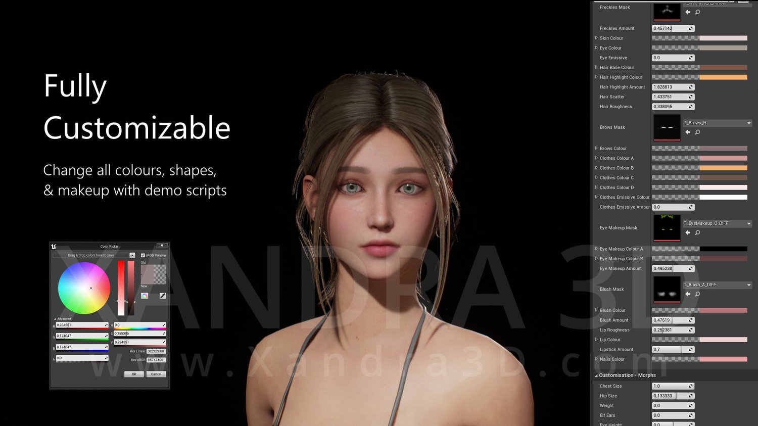 - Includes example customization blueprint. Change skin, hair, eye colors, makeup, brows, and much more.