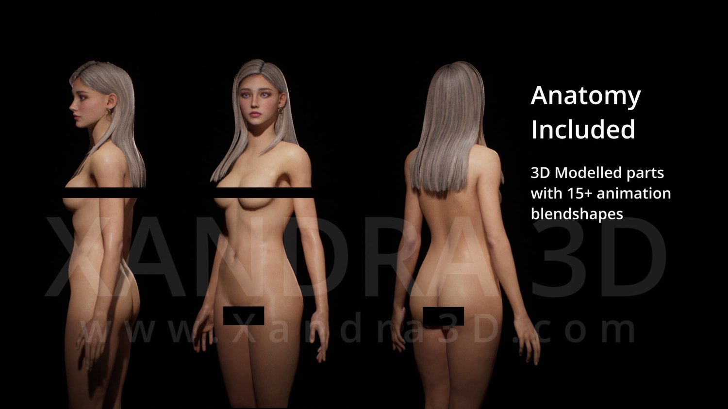 This character includes a base body addon with modeled uncensored anatomical parts with over 15 animation morphs.