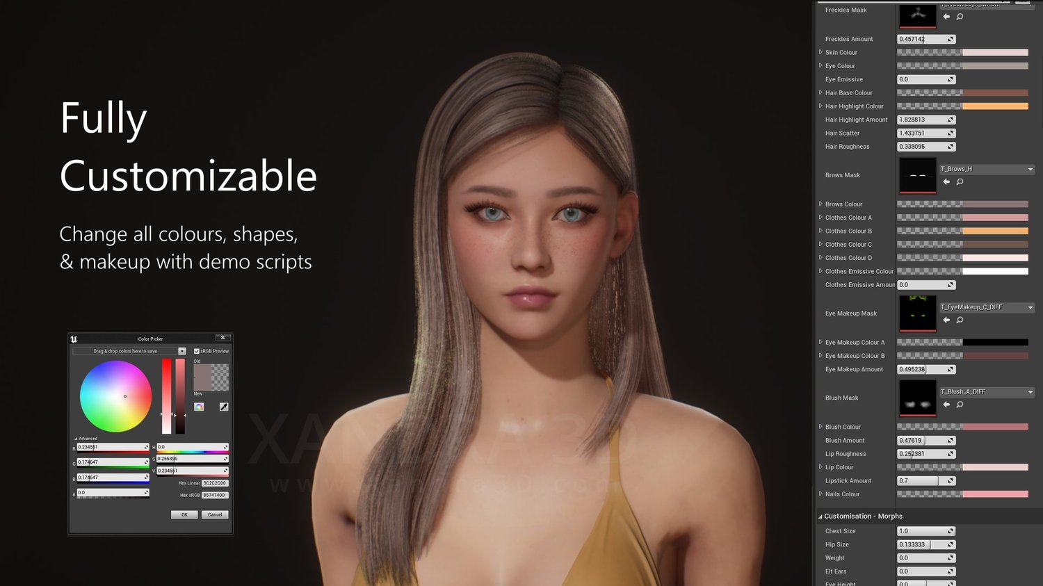 - Customizable character blueprint. Change skin, hair, eye colours and much more.